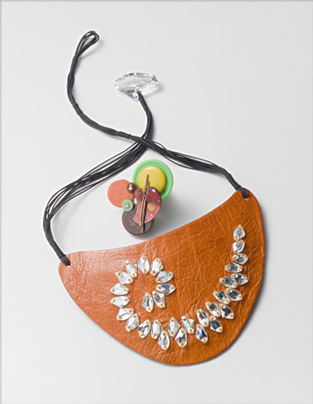 ネックレス/イタリアン・レザー クリスタル・グラス(革部分 12cm×17cm) コットン紐 43,000yen(45,150yen) ブローチ/樹脂 5.5cm×5.5cm 13,000yen(13,650yen)