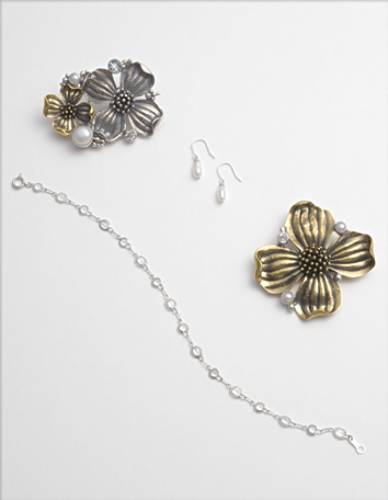 ブレスレット/ホワイトトパーズ K18wg 長さ17.5cm 31,000yen(32,550yen) ブローチ2点ともに/パール ホワイトトパーズ SV 真鍮 ブローチ後 33,000yen(34,650yen) ブローチ前 21,000yen(22,050yen) ピアス/パール(縦6mm) K18wg 10,000yen(10,500yen)